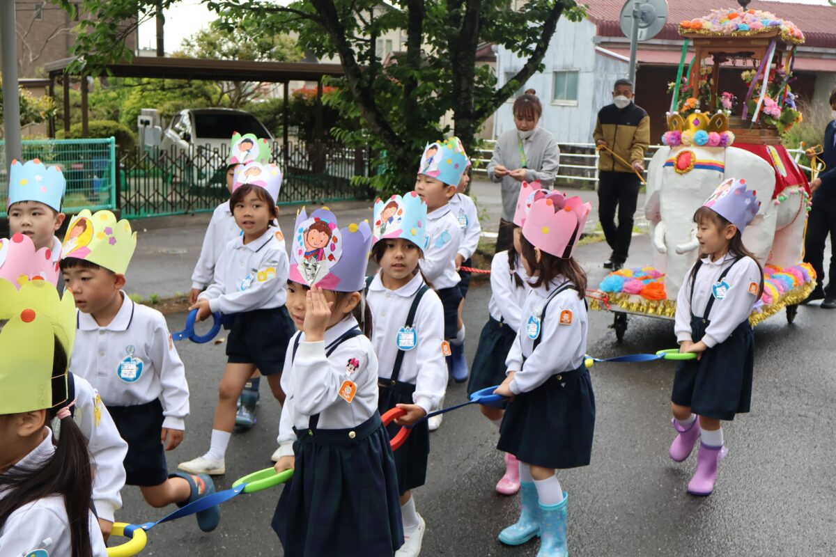 年長組さんがのの様の乗った白象を引きながら