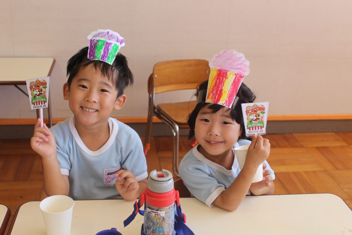 ポップコーンまつり 2023.9.29 年中組さんが収穫したポップコーンで ポップコーンまつりを楽しみました。 パンダルームでポップコーン屋さんが開店です。 料理長は太田料理長です。 プライパンをふり続けて今年で9年目だそうですよ。 ポンポンはじけるポップコーンと園内に漂ういい匂い! 年中組さんだけではなく、 年少・年長組さんも出来立てのポップコーンを楽しみました。