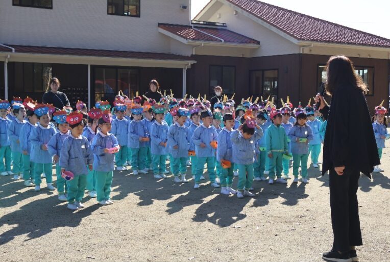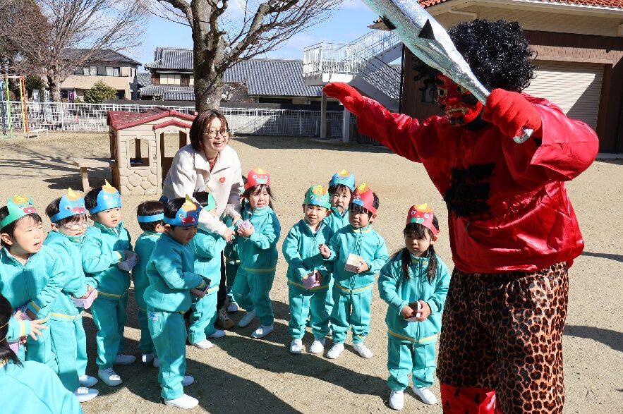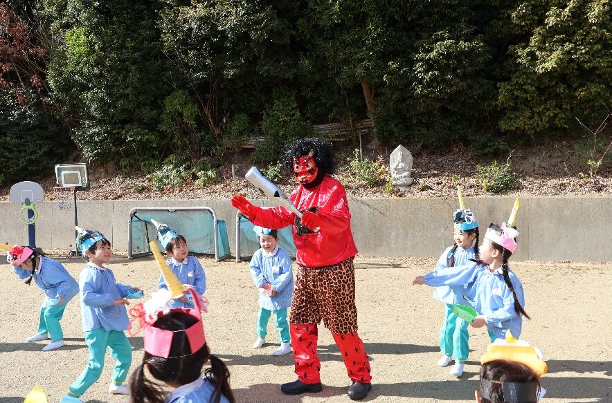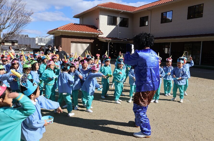 豆まき👹 (第2すずかきしおか幼稚園) 2026.2.4 2月3日は節分でしたね。 この日は幼稚園でも園庭で豆まきを行いました。 自分で作った鬼のお面をかぶり、 もうすぐ鬼が来るという緊張感の中、 園長先生のお話を聞きます。 先生から豆を配ってもらって、いよいよ豆まきのスタートです! やって来たのは青鬼と赤鬼👹 「おにはそと~」と勇敢に豆をまく子どもたち。 豆がなくなると、慌てて逃げて、先生の後ろに隠れるお友だちも。 最後はお山に帰っていく鬼たちにみんなで手をふってお別れしましたよ👋