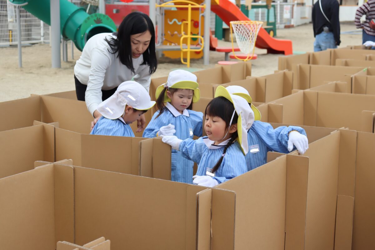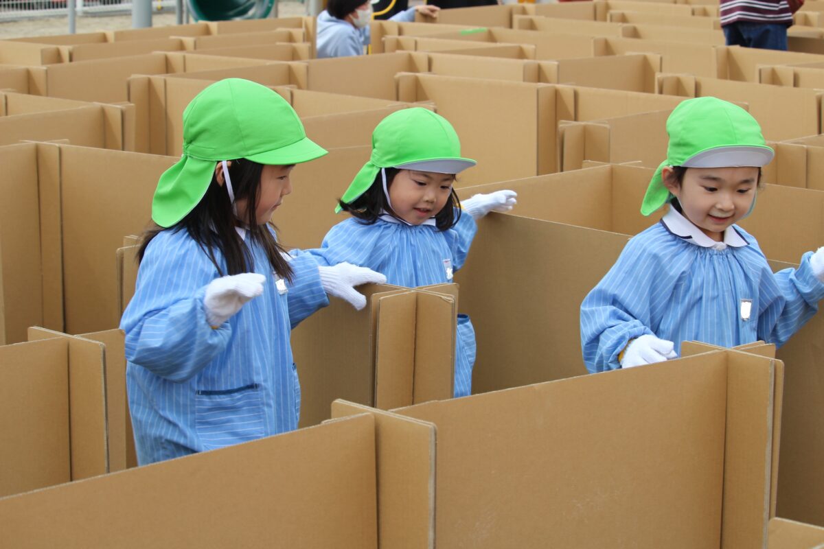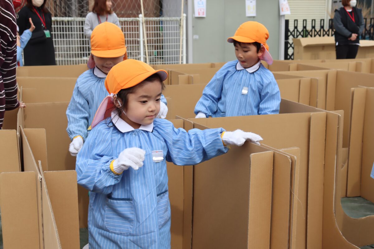 ダンボール迷路 (すずか幼稚園) 2026.3.3 3月2日の朝、いつものように登園してきた子どもたちですが、 園庭には大きなダンボールでできた迷路が! 本部役員さんが朝から頑張って組み立てて下さいました。 子どもたちは一刻も早く迷路に挑戦したくて ワクワクが止まりません。 「あっちに行ってみよう」 「こっちは行き止まりだよ!」 と、お友だちと協力して みんな無事にゴールにたどり着くことが出来ました💮 本部役員の皆さま、ありがとうございました。